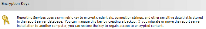 报表服务器的加密管理,主要是对称性密钥的管理,打开Reporting Service配置管理器(Reporting Service Configuration Manager,简称RSCM),切换到Encryption Keys选项卡,能够看到对称性密钥管理的界面,主要是密钥的备份,还原,更新和删除。