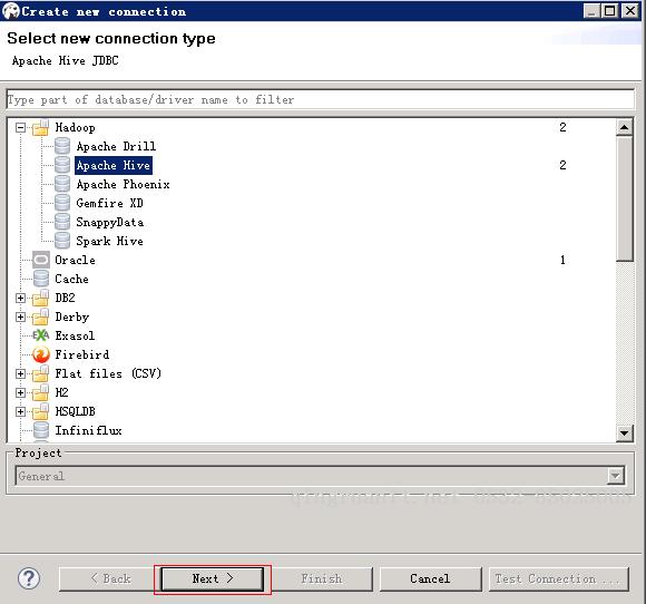 首先新建一个连接(可以看到支持的数据库非常多),选择Apache Hive,点击下一步。