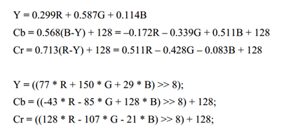 一个流水线设计需要4个步骤完成一个数据的处理过程,那么从有数据输入的第一个时钟周期开始,直到第4个时钟周期处理完第一个数据,但在以后的每一个时钟周期都会有处理完成的数据输出,流水线设计在开始处理时需要一定的处理时间,但以后就会不断的输出数据,从而大大提高处理速度。(面积换速度)如果不采用流水线设计,那么处理一个数据就需要4个时钟周期,而采用流水线设计则能够提高将近4倍的处理速度,用一个复杂的算术式子举例,这是官方给的RGB888 to YCbCr的算法公式,我们可以直接把算法移植到FPGA上,但是我们都知道FPGA无法进行浮点运算,所以我们采取将整个式子右端先都扩大256倍,然后再右移8位,这样就得到了FPGA擅长的乘法运算和加法运算了。