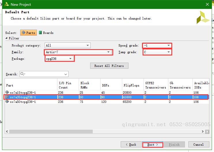 选择板卡型号,我这里使用的是A-7系列的basys3,用户根据自己的板卡型号自定义,next~