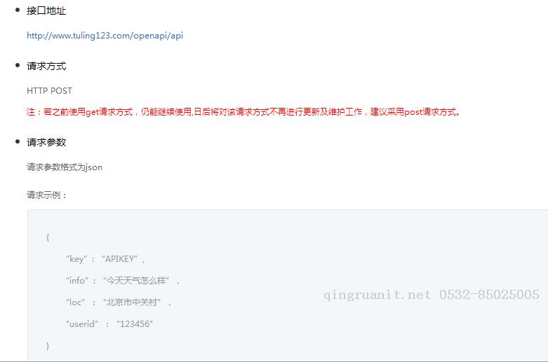 这是反馈的结果,那么我们来看下图灵机器人这边给的接口文档,http://www.tuling123.com/help/h_cent_webapi.jhtml?nav=doc这是文档中心,这里的编写很规范的,我们看到这个就很好知道我们想要用的接口,需要的东西,以及简单的接口说明,我们可以从这里很快的得到我们想要的信息。