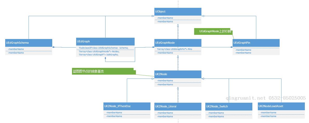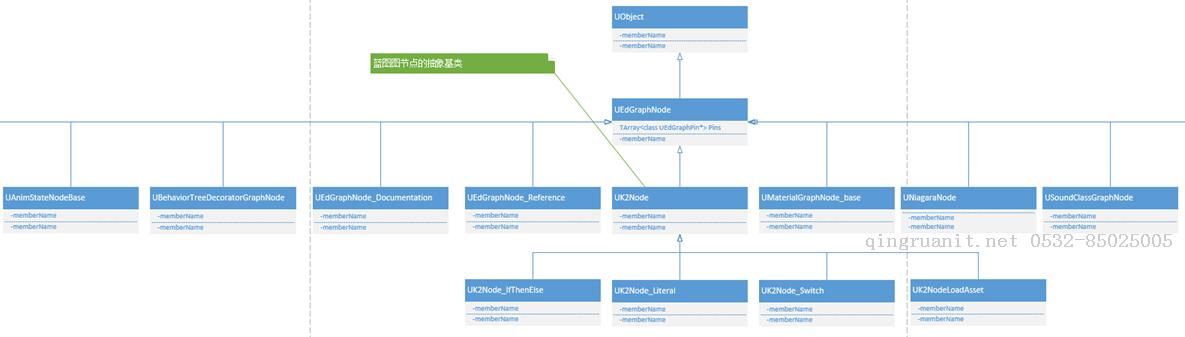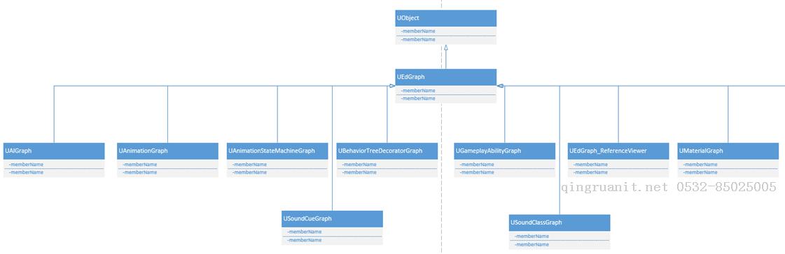 虚幻4中许多其它的也是使用图来实现的,所以它也有许多的派生类,比如UAIGraph、UAnimationGraph、UAnimationStateMachineGraph、UMaterialGraph等等。类图如下所示: