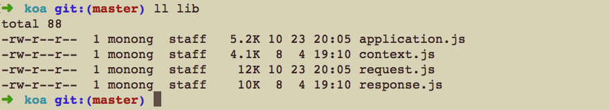 lib 目录下只有四个文件,其中 request.js 和 response.js 是对 node 原生的 request(req) 和 response(res) 的增强,提供了很多便利的方法,context.js 就是著名的上下文。我们暂时抛开这三个文件的细节,先看下主文件 application.js 的实现。