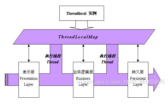 从上面图中我们可以看到,由于ThreadLocal所操作的是维持于整个Thread生命周期的副本(ThreadLocalMap),所以无论在J2EE程序程序的哪个层次(表示层、业务逻辑层或者持久层),只要在一个Thread的生命周期之内,存储于ThreadLocalMap中的对象都是线程安全的(因为ThreadLocalMap本身仅仅隶属于当前的执行线程,是执行线程内部的一个属性变量。我们用图中的阴影部分来表示这个变量的存储空间)。而这一点,正是被我们用于来解决多线程环境中的变量共享问题的核心技术。ThreadLocal的这一特性也使其能够被广泛地应用于J2EE开发中的许多业务场景。