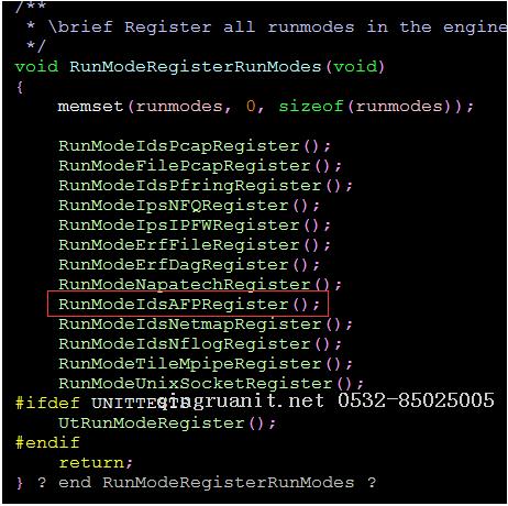 首先注册runmods,运行方式指定suricata获取报文的方式,例如libpcap、netmap、af-packet等,代码如下图所示: