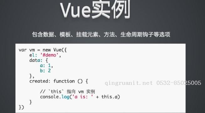 在一个html文件中,我们直接可以通过script标签引入Vue.js,然后就可以在页面里写Vue.js代码了。上图中我们通过new Vue()构建了一个Vue的实例,在实例中,可以包含挂在元素(el),数据(data),模板(template),方法(methods)与生命周期钩子(created等)等选项。不同的实例选项拥有不同的功能,如: