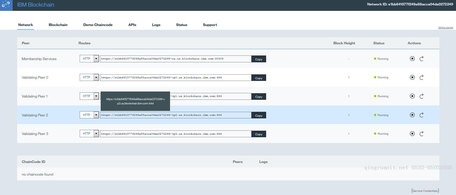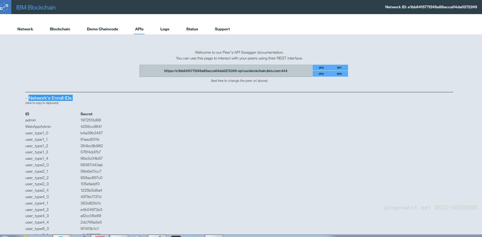首先在区块服务页面中选择 APIs, 然后展开Network's Enroll IDs列表以获取预置的用户名和密码列表 。