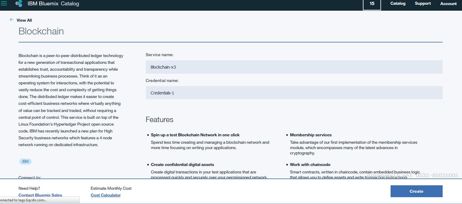 登录Bluemix后,在Catalog页面中选择Application Services下的Blochain服务。