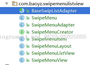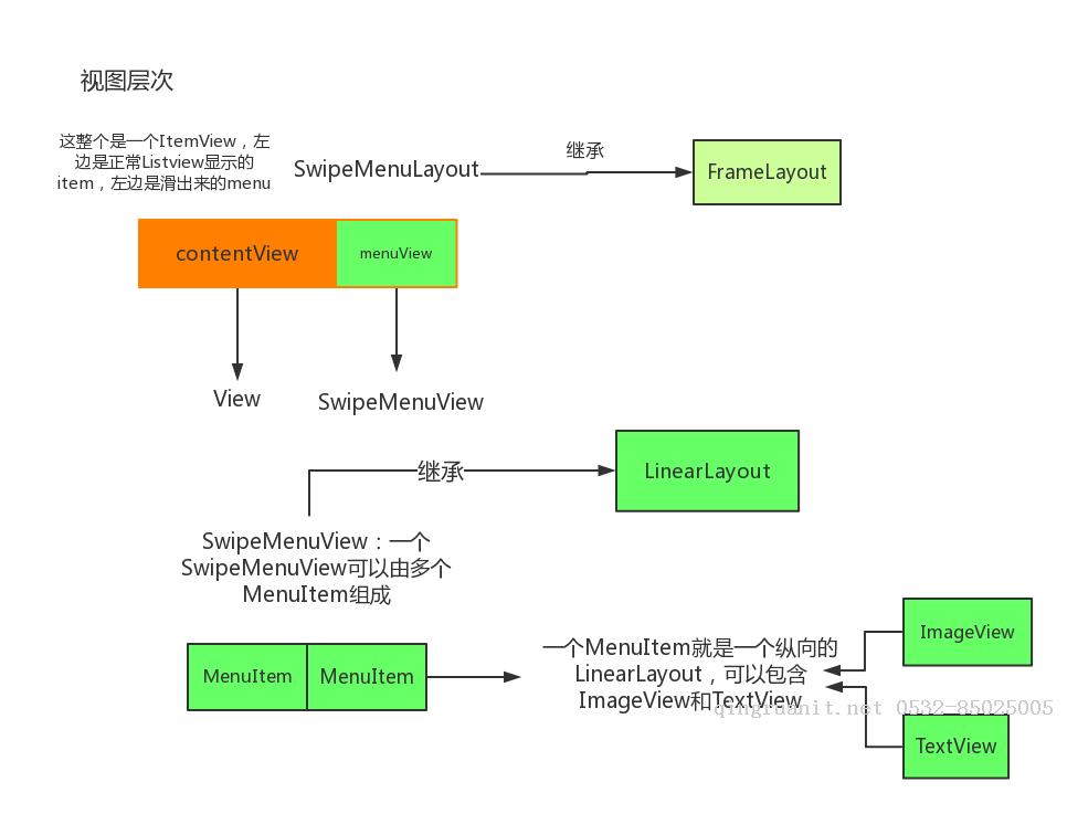 上面的图中:SwipeMenuLayout是ListView中item的布局,分左右两部分,一部分是正常显示的contentView,一部分是滑出来的menuView;滑出来的SwipeMenuView继承自LinearLayout,添加view时,就是横向添加,可以横向添加多个。