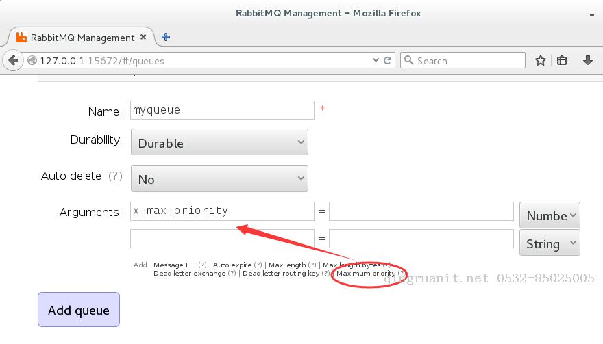 既然是优先级队列,那么必然要在Queue上开一个口子贴上一个优先级的标签,为了看怎么设置,我们用一下rabbitmq的监控UI,看看这个里面是如何