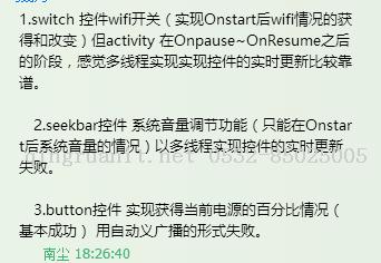 如果在应用中有一个判断wifi的开关和一个当前音量大小的seekbar以及一个获取当前电量多少的按钮,想知道如果按home键后调整了wifi开关信息以及媒体音量信息,再切换到前台UI如何才会实时刷新。其实这个问题不难解决,如果你了解activity的生命周期,只需要把设置开关和seekbar的信息放在onResume中就好了,因为无论是锁屏后打开或者是切换后台再前台都是会调用onResume的。但不由得滋生一个问题,大家都知道APP在前台的情况下用户依然是可以下拉状态栏设置Wifi开关信息的,对于音量信息也是可以侧边增减,那APP一直在前台,生命周期明显是无法实时更新了,那我们应该如何解决呢?没错,没当改变系统属性的时候,都会发出系统广播,我们只需要去写一个接收器,并根据它做响应的操作就好了。