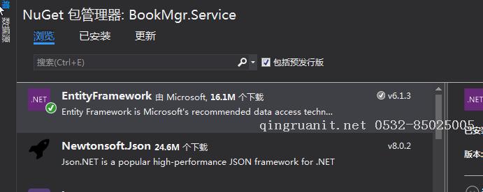 1) 安装过程同上一篇文章中类似。使用NuGet下载最新版的Entity Framework 6.1.3。在解决方案资源管理器中——>在项目BookMgr.Service上鼠标右键单击——>弹出一个菜单,选中“管理解决方案的NuGet程序包”,打开NuGet程序包管理界面。如下图。