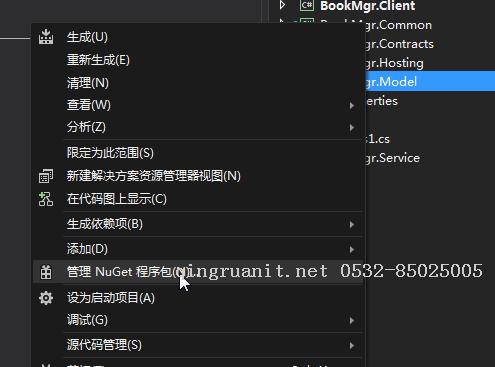 1) 在“解决方案资源管理器”中使用鼠标右键,点击“BookMgr.Service”项目,在弹出菜单上,依次选择“添加—》WCF服务”