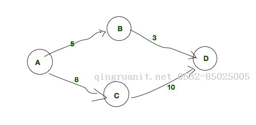 在聊关键路径之前,我们先看一个简单的实例,如下图所示。我们将下方这个有向无环图看做是整个工程,将每个节点看做是该项目工程的一个子工程。子工程间又有一定的优先级。在下方图中,A的优先级最高。A做完后,B、C才可以进行开发。B、C完成后,我们才可以开发D。从下图中我们不难看出,该图的拓扑序列为A, B, C, D。如果我们按照串行的方式来完成此工程的话,那么工程完成的顺序可以是A-5->B, A-8->C, B-3->D, C-10->D。总时间为26。