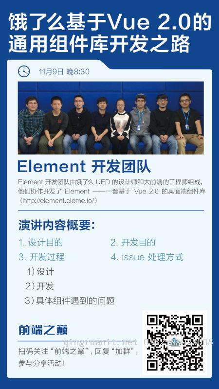 Element 是由饿了么UED设计、饿了么大前端开发的一套基于 Vue 2.0 的桌面端组件库。今天我们要分享的就是开发 Element 的一些心得。