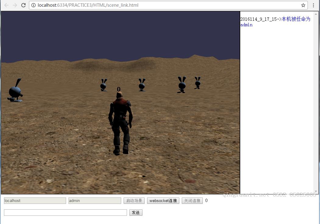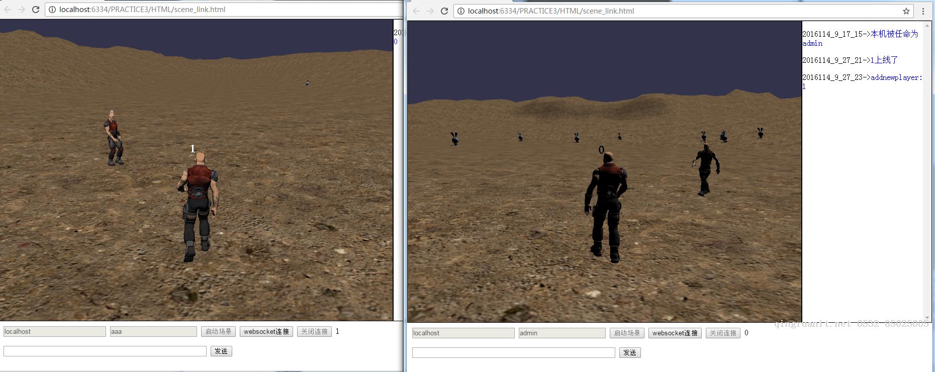上图,一个局域网中的新玩家进入场景,(他们头上的数字是WebSocket分配的session id),兔子们受到0和1的叠加影响。