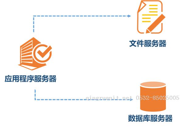 二、随着业务扩展,一台服务器无法满足性能需求,将应用程序、数据库、文件分别部署在不同的服务器上,并根据服务器用途不同,配置不同的硬件,达到性能最佳的效果。