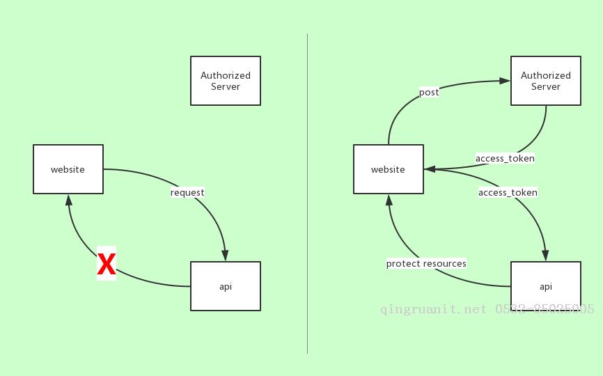 就像左图展示的那样,发起了请求但是拿不到想要的结果;当站点先去授权服务器拿到了可以访问api的access_token(令牌)后,再通过这个