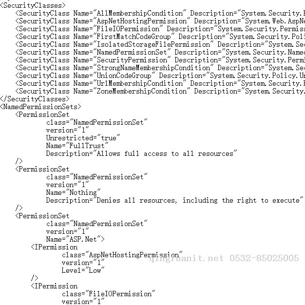SecurityClasses中添加了一些下面各种配置用到的安全类,包括以CodeAccessPermission为基类的代码访问权限,其包含在各个权限集PerssionSet里面;以Condition为后缀的类,用于判定被测试的程序集是否属于代码组,以CodeGroup为基类的代码组类,实际上这些类我也没了解太多。PermissionSet节点是权限配置的集合,其Name属性为ASP.NET的指的是。里面的子节点IPermission则是对CodeAccessPermission的子类的配置。IPermission的class属性的值需要和SecurityClass节点的name属性对应。针对不同的Permission权限类可以指定不同的配置。